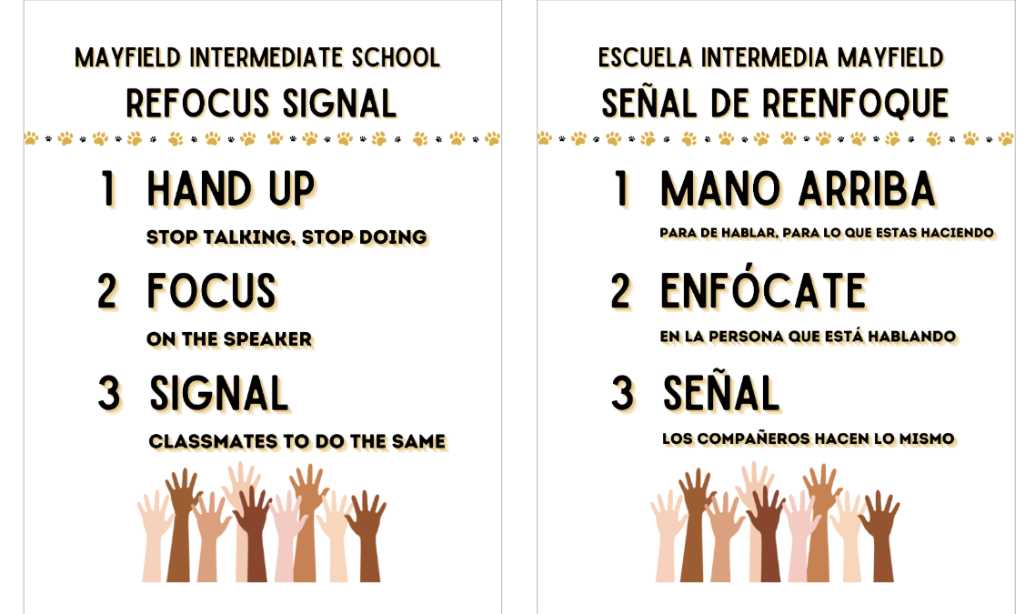 As part of our ongoing commitment to strengthening our schoolwide Behavior Support Systems, Mayfield has recently implemented two consistent tools to support a calm, focused, and respectful learning environment: our voice level expectations and a unified refocus signal. These routines were introduced through daily announcements and reinforced in classrooms, helping students understand that being their “Bobcat Best” means using the right voice at the right time and quickly refocusing when an adult signals for attention. Throughout the first two weeks, students practiced these expectations during instruction and transitions, building habits that promote both individual responsibility and a strong learning community. We have already seen a positive impact, with many students demonstrating improved focus, smoother transitions, and increased awareness of how their actions support others. By continuing to reinforce these practices, we are helping all students contribute to a calm, respectful, and productive environment where everyone can succeed.